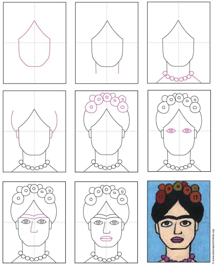 Your assignment is to follow the step-by-step instructions below on how to draw Frida Kahlo’s face and then colour it using colored pencils. All the details and instructions are provided on the last slide of the presentation.